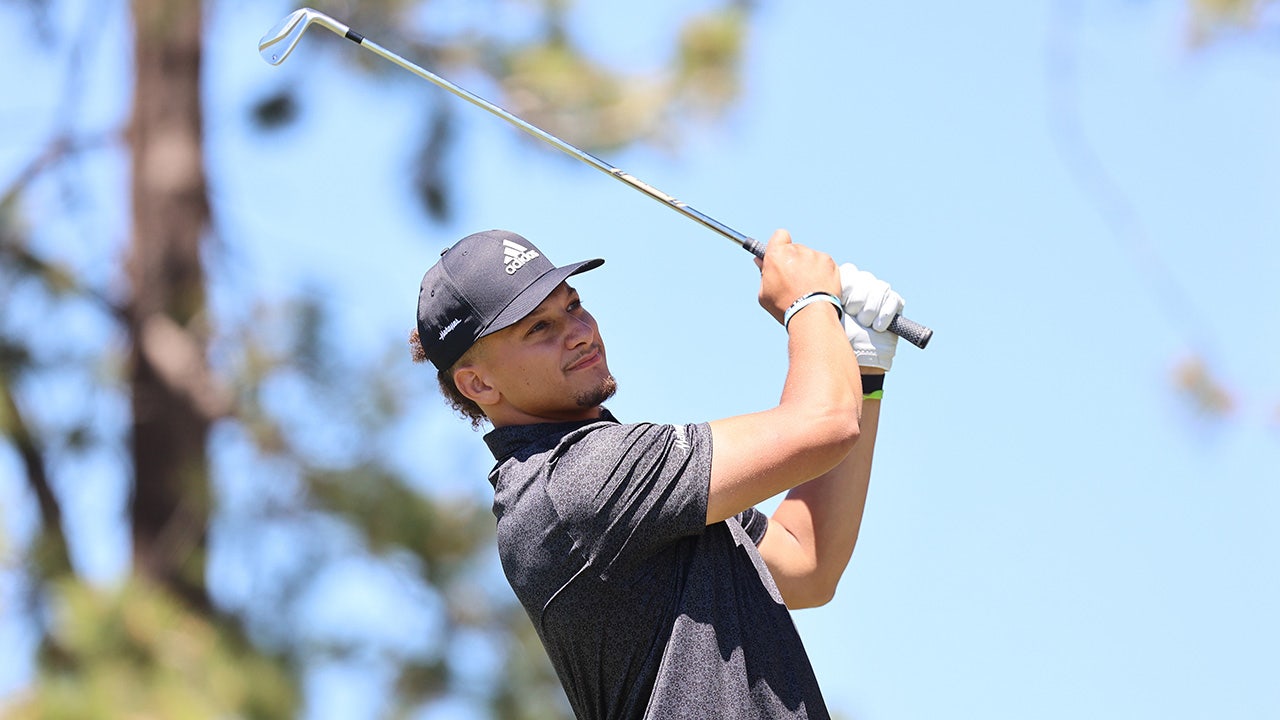 Patrick Mahomes of the Kansas City Chiefs hits a shot on Day One of the 2023 American Century Championship at Edgewood Tahoe Golf Course in Stateline, Nevada, on Friday. (Isaiah Vazquez/Getty Images)