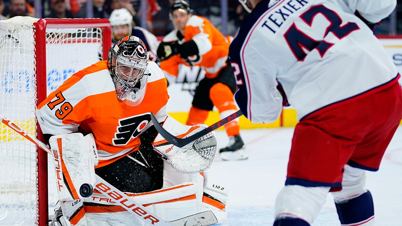 Philadelphia Flyers' Carter Hart, left, blocks a shot by Columbus Blue Jackets' Alexandre Texier during the first period of an NHL hockey game, Thursday, Jan. 20, 2022, in Philadelphia. (AP Photo/Matt Slocum)