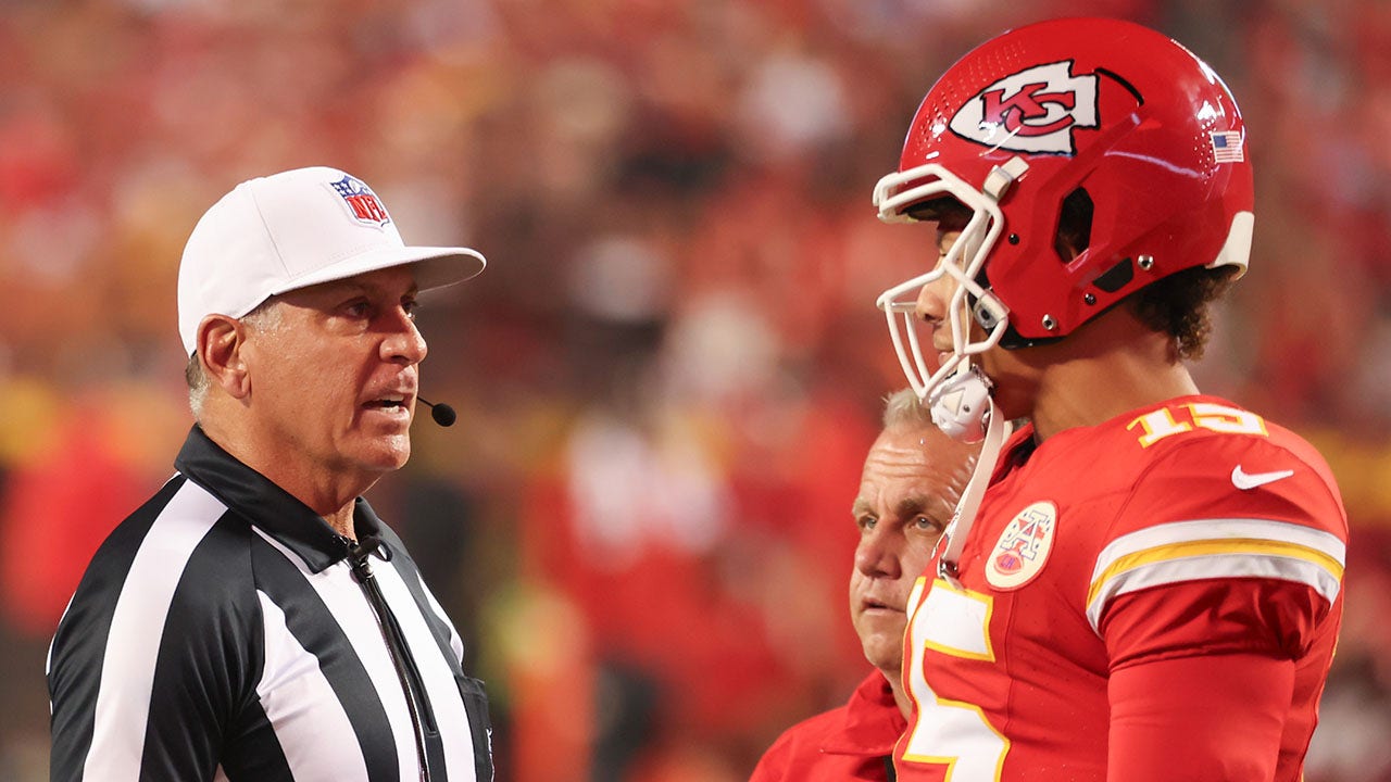 Kansas City Chiefs quarterback Patrick Mahomes (15) talks with referee John Hussey in the third quarter in a game against the Detroit Lions Sept. 7, 2023, at GEHA Field at Arrowhead Stadium in Kansas City, Mo. (Scott Winters/Icon Sportswire via Getty Images)