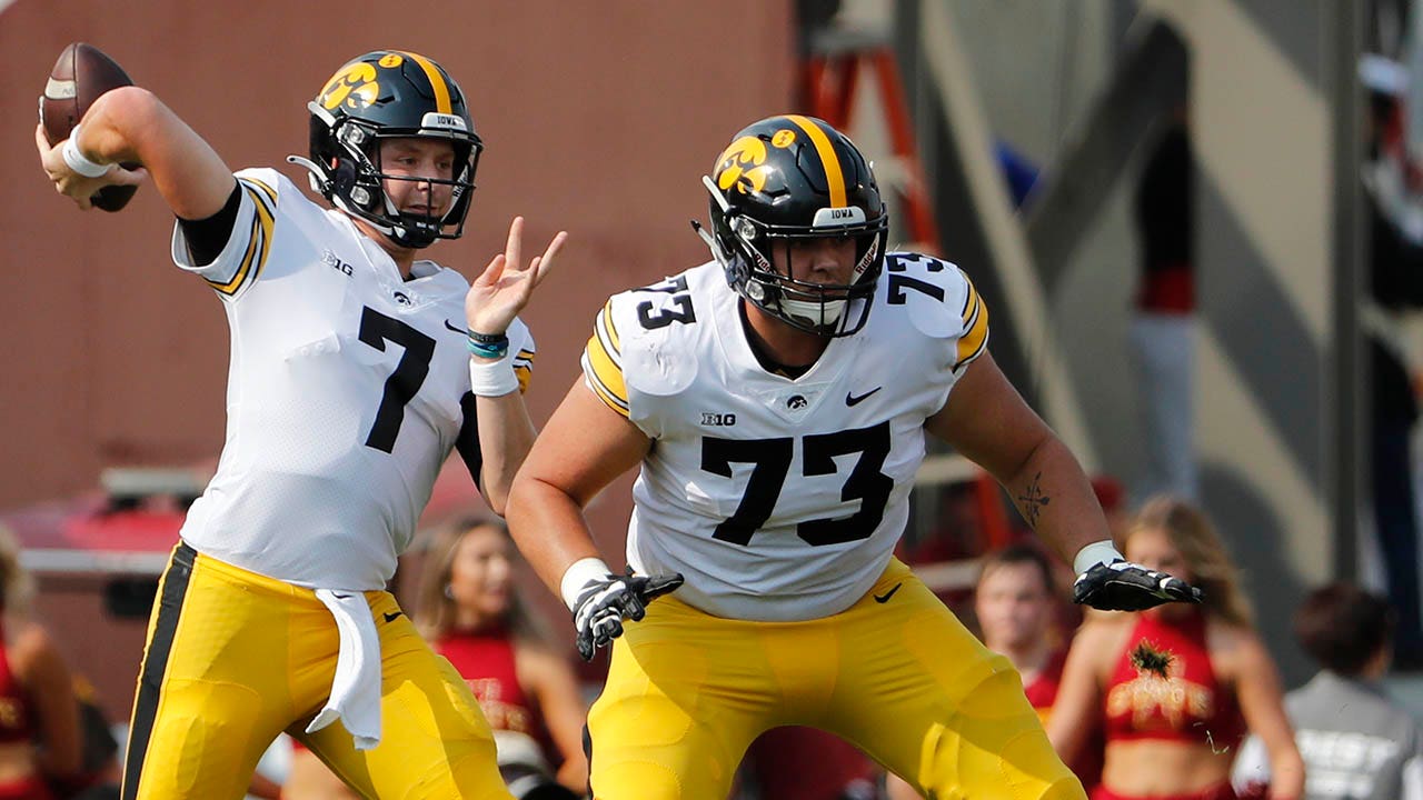 Quarterback Spencer Petras of the Iowa Hawkeyes passes as offensive lineman Cody Ince defends against the Iowa State Cyclones at Jack Trice Stadium on Sept. 11, 2021 in Ames, Iowa. (David K Purdy/Getty Images)