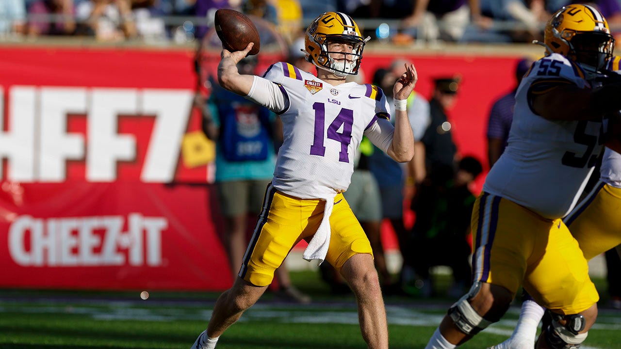 LSU Tigers quarterback Walker Howard (14) throws a pass during the Cheez-It Citrus Bowl between the LSU Tigers and the Purdue Boilermakers on January 2, 2023 at Camping World Stadium in Orlando, Fl. (David Rosenblum/Icon Sportswire via Getty Images)