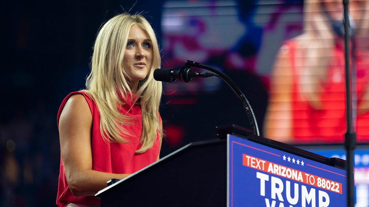 Riley Gaines speaks during a campaign rally for former President Trump at Desert Diamond Arena on Aug. 23, 2024, in Glendale, Arizona. (Rebecca Noble/Getty Images)