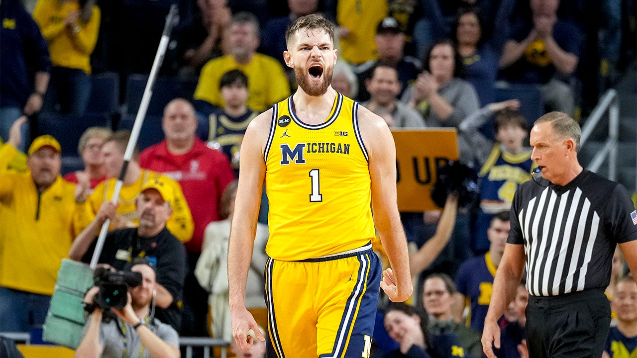 Hunter Dickinson, #1 of the Michigan Wolverines, reacts in a game against the Wisconsin Badgers at Crisler Arena on February 26, 2023, in Ann Arbor, Michigan. (Nic Antaya/Getty Images)