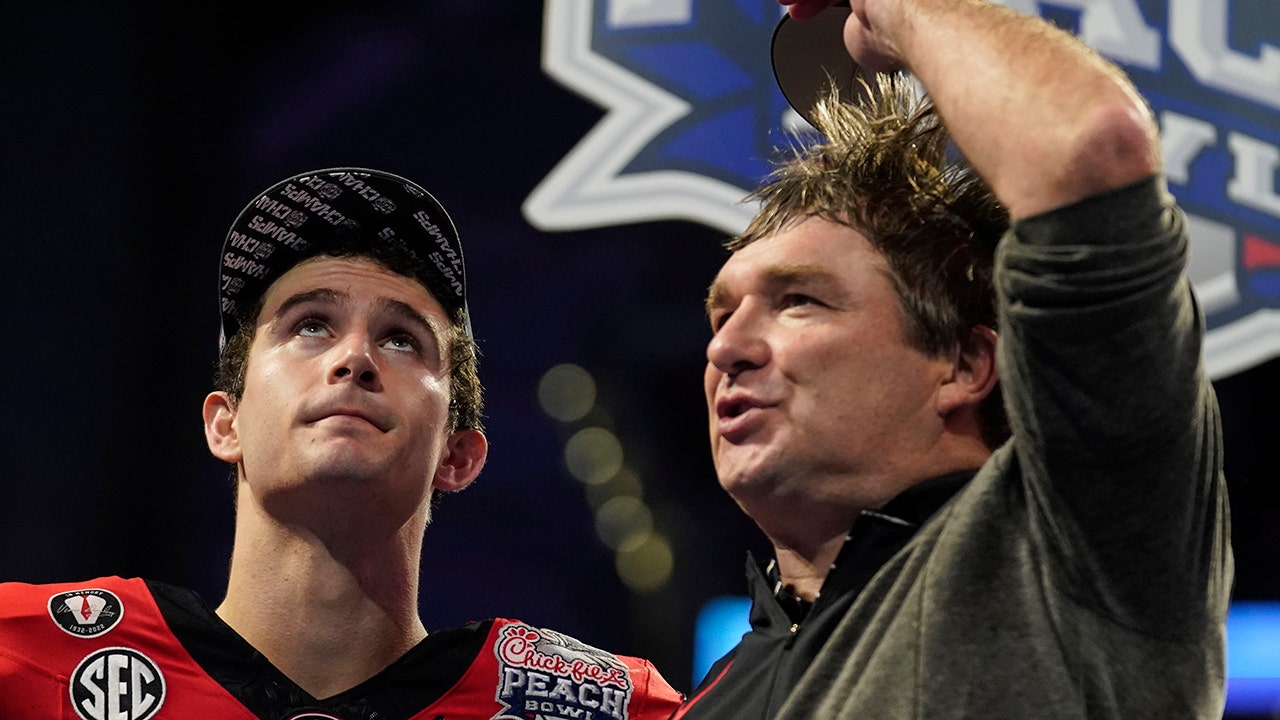 Quarterback Stetson Bennett and head coach Kirby Smart after Georgia's victory over Ohio State in the Peach Bowl, Saturday, Dec. 31, 2022, in Atlanta. (AP Photo/Brynn Anderson)