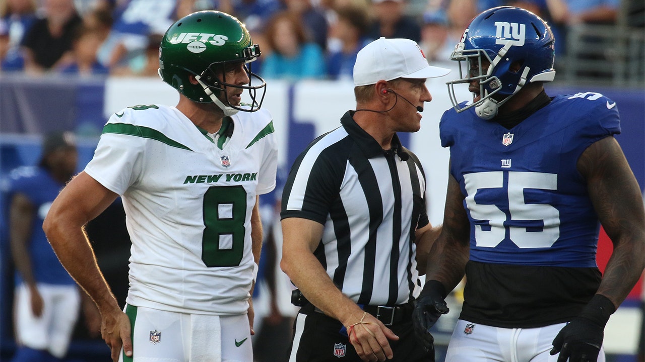 Jets QB Aaron Rodgers and the Giants' Jihad Ward are separated during Saturday's preseason game. (Chris Pedota/USA Today Network)