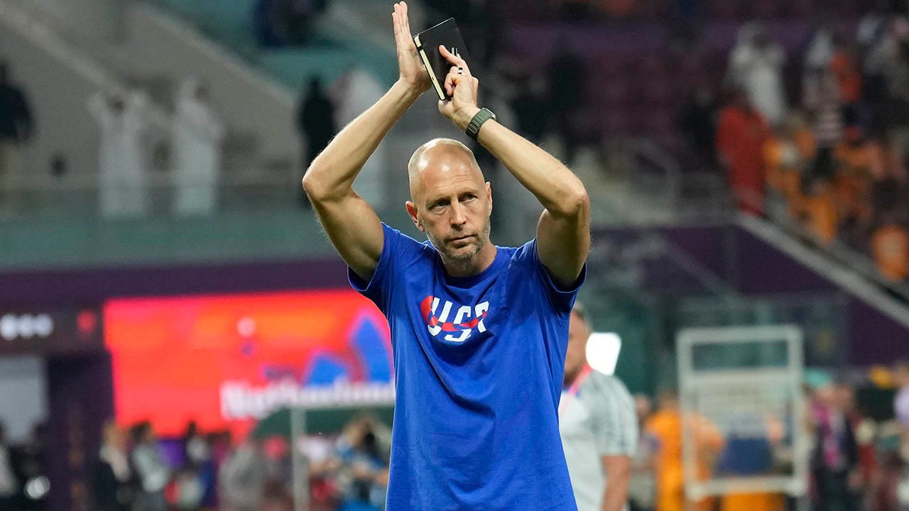 head coach Gregg Berhalter of the United States salutes supporters at the end of the World Cup round of 16 soccer match between the Netherlands and the United States, at the Khalifa International Stadium in Doha, Qatar, Saturday, Dec. 3, 2022. (AP Photo/Francisco Seco)