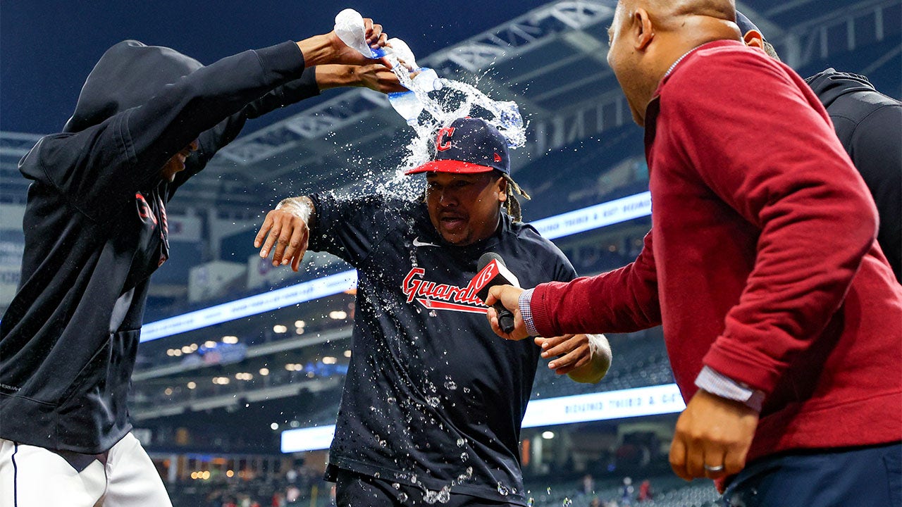 Cleveland Guardians third baseman José Ramírez (11) is doused with water by teammate Triston McKenzie (24) as they celebrate Ramirez's three home run game against the Boston Red Sox June 8, 2023, at Progressive Field in Cleveland. (Frank Jansky/Icon Sportswire via Getty Images)
