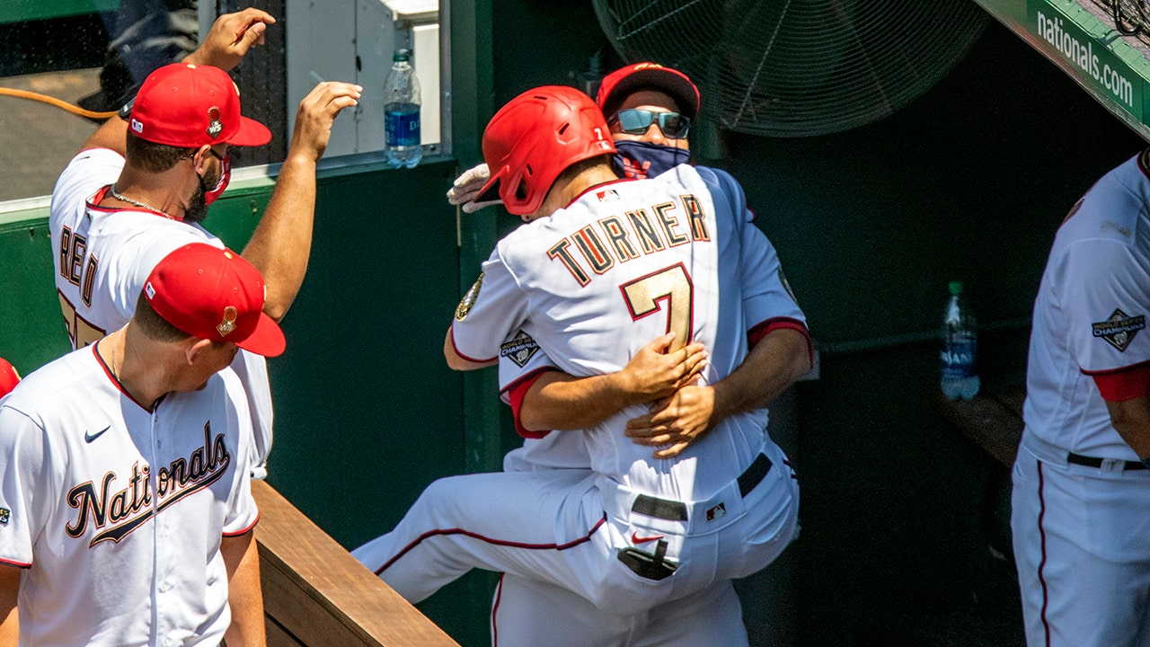In another instance Sunday, Washington Nationals shortstop Trea Turner jumped into catcher Kurt Suzuki’s waiting arms in the dugout for a bear hug after Turner’s home run.