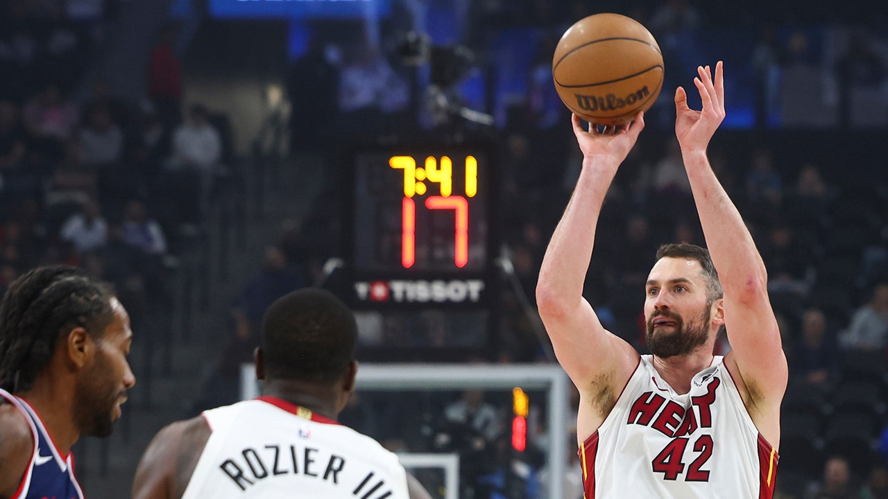 Miami Heat forward Kevin Love looks to shoot against the Clippers, Monday, Jan. 13, 2025, in Los Angeles. (AP Photo/Jessie Alcheh)