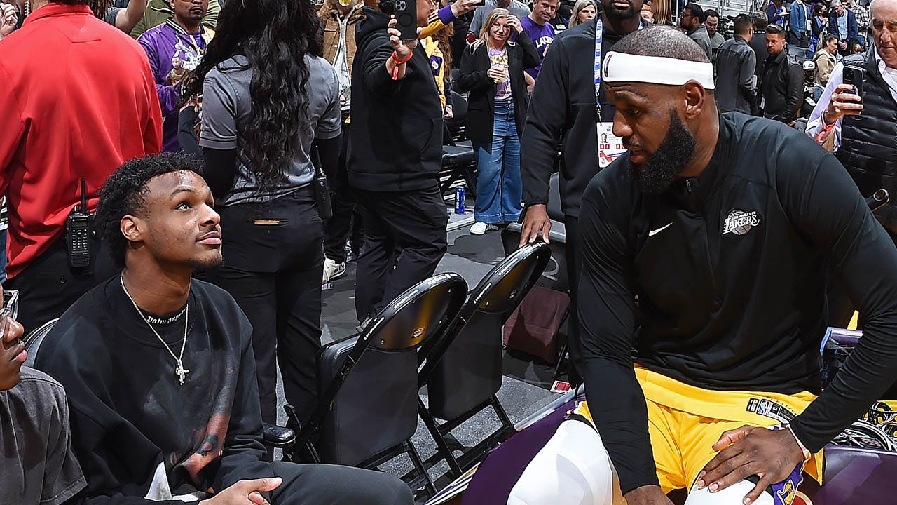 Bronny James and his father, LeBron James of the Los Angeles Lakers, talk during a game at Crypto.Com Arena in Los Angeles on Feb. 7, 2023. (Andrew D. Bernstein/NBAE via Getty Images)