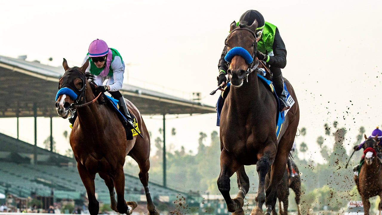 Richi and jockey Kazushi Kimura, right, win the Grade III $100,000 Las Flores Stakes horse race Jan. 4, 2025, at Santa Anita Park in Arcadia, Calif. (Benoit Photo via AP)