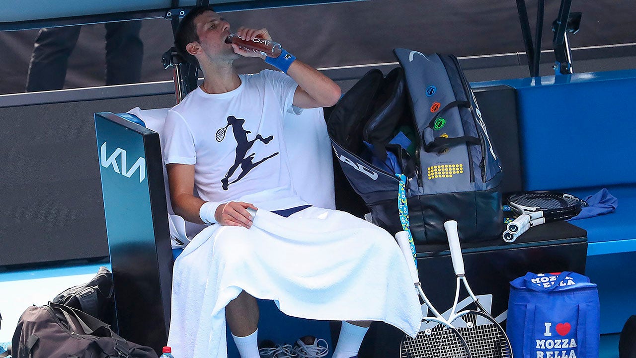 Defending champion Serbia's Novak Djokovic takes a drink during a practice session at the Rod Laver Arena ahead of the Australian Open at Melbourne Park in Melbourne, Australia, Tuesday, Jan. 11, 2022. The prime ministers of Australia and Serbia have discussed Novak Djokovic's precarious visa after the top-ranked Serbian tennis star won a court battle to compete in the Australian Open but still faces the threat of deportation because he is not vaccinated against COVID-19. (Kelly Defina/Pool Photo via AP)