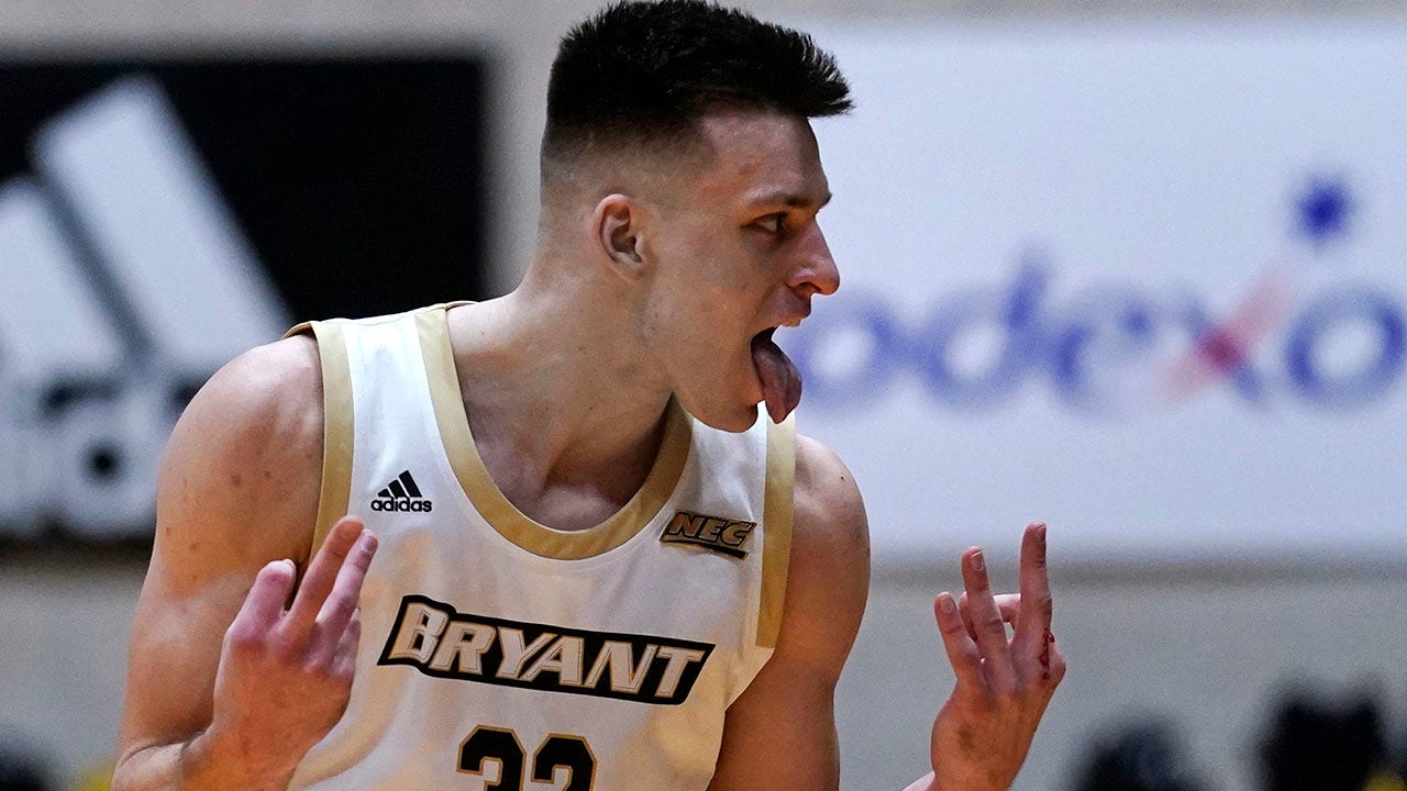Bryant guard Peter Kiss celebrates after hitting a 3-pointer during the first half of the Northeast Conference men's NCAA college basketball championship game against Wagner, Tuesday, March 8, 2022, in Smithfield, R.I. (AP Photo/Charles Krupa)