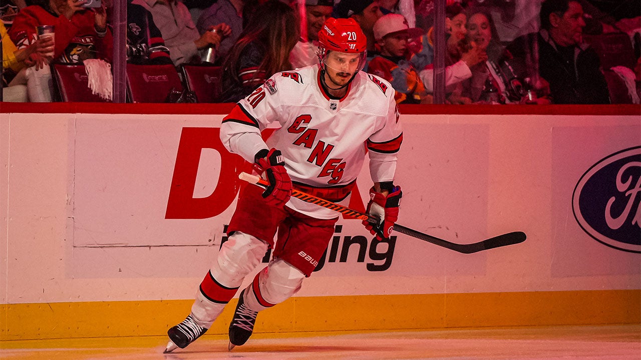 Sebastian Aho #20 of the Carolina Hurricanes takes the ice prior to Game Three of the Eastern Conference Final of the 2023 Stanley Cup Playoffs against the Florida Panthers at FLA Live Arena on May 22, 2023 in Sunrise, Florida. (Josh Lavallee/NHLI via Getty Images)
