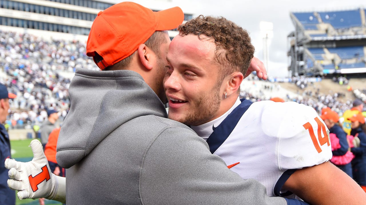 Oct 23, 2021; University Park, Pennsylvania, USA; Illinois Fighting Illini wide receiver Casey Washington (right) celebrates following the game against the Penn State Nittany Lions at Beaver Stadium. (Rich Barnes-USA TODAY Sports)
