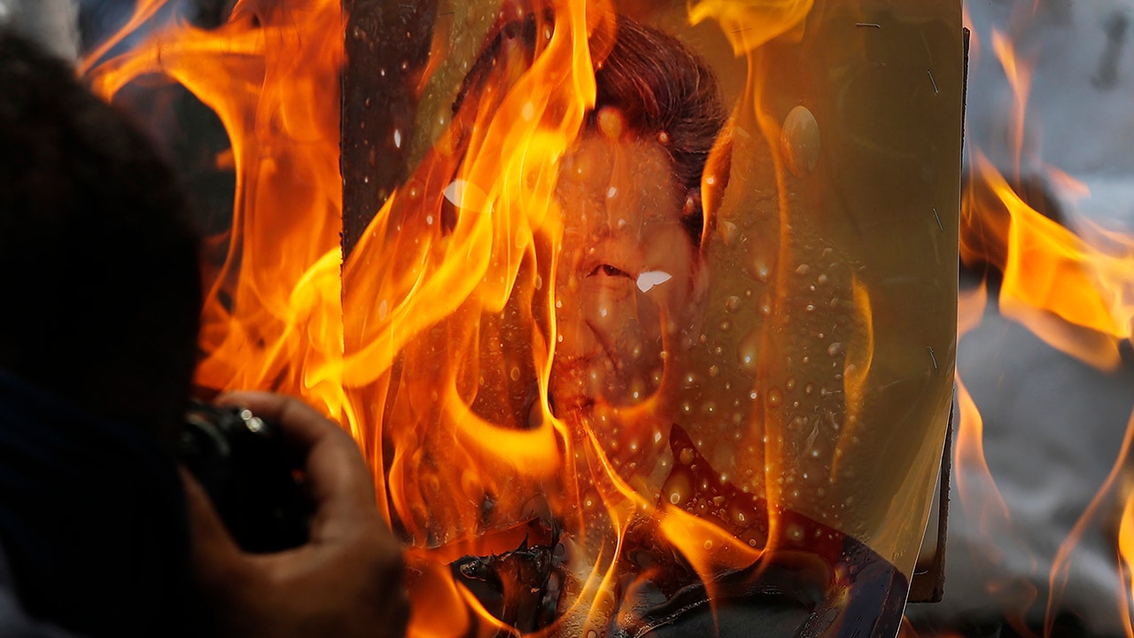 FILE- Indian traders reacting to the killing of Indian troops in a clash with Chinese soldiers in eastern Ladakh burn Chinese products and a poster president Xi Jinping during a protest in New Delhi, India, June 22, 2020. India will stay away from the opening and closing ceremonies of the Beijing Winter Olympics with an Indian official accusing China of politicizing the event. India objected to China using a soldier involved in fighting with Indian forces in Eastern Ladakh as a torchbearer for the Olympics ceremony.