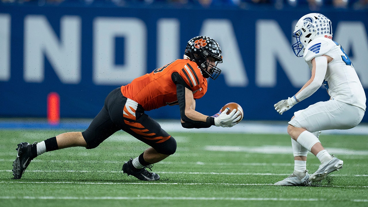 Lawrenceburg Tigers Noah Knigga makes a catch during the state championships, Nov. 26, 2022 at Lucas Oil Stadium in Indianapolis. (Armond Feffer/IndyStar/USA Today Network)