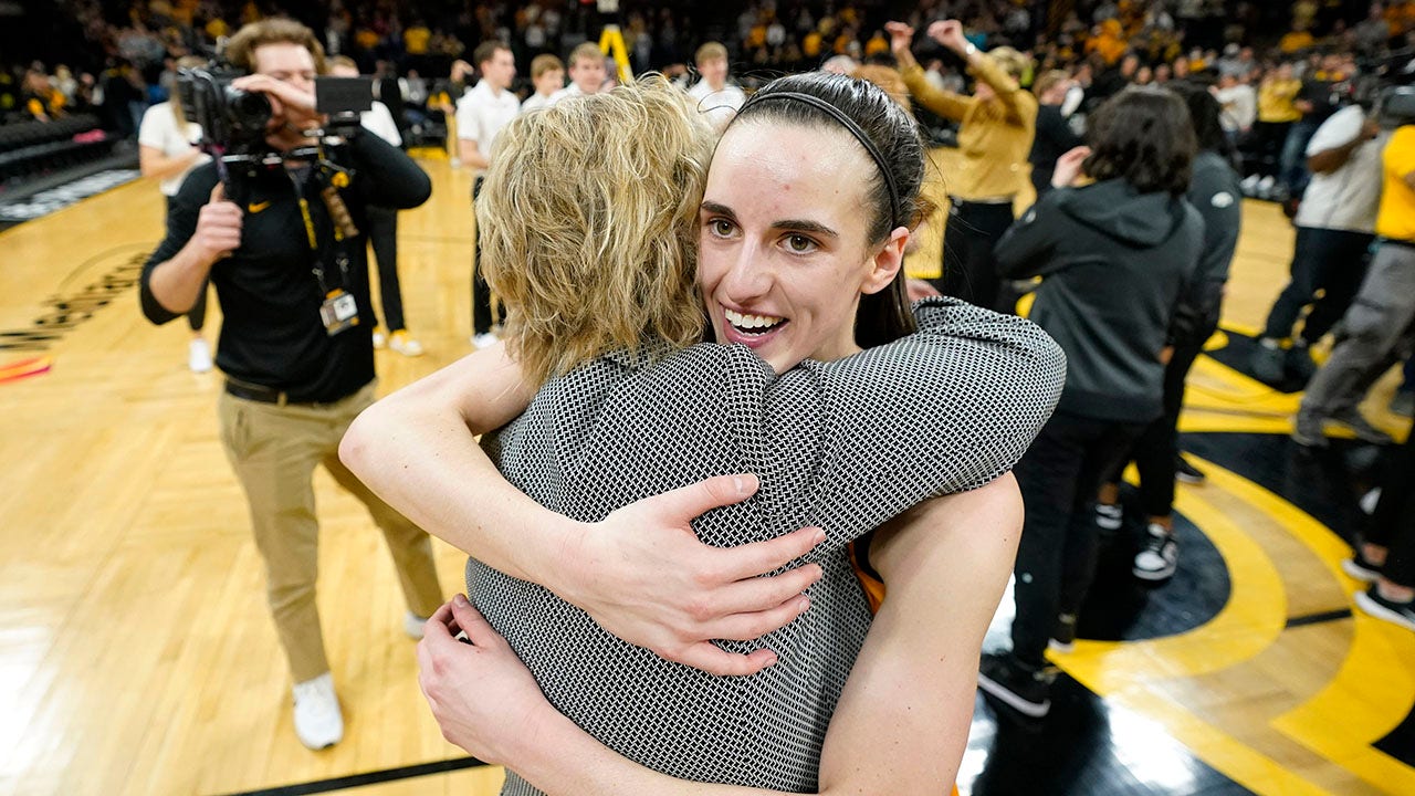 Iowa guard Caitlin Clark gets a hug from head coach Lisa Bluder, left, after an NCAA college basketball game against Michigan, Sunday, Feb. 27, 2022, in Iowa City, Iowa. Iowa won 104-80. (AP Photo/Charlie Neibergall)