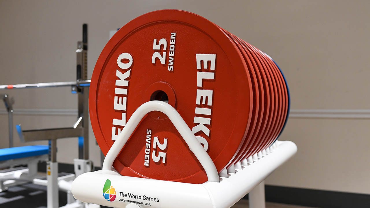 A stack of weights is seen in the warm-up room at the Men's Middleweight Powerlifting event at the World Games 2022 at Birmingham-Jefferson Convention Complex Concert Hall in Birmingham, Alabama, on July 9, 2022. (Kevin Langley/Icon Sportswire via Getty Images)