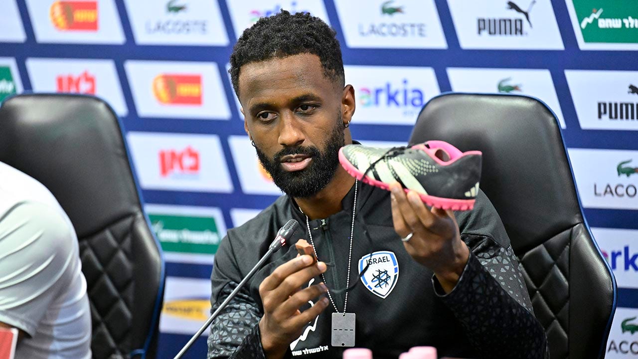 Israel soccer captain Eli Dasa used an opportunity to speak at a news conference to show the shoe of a young boy who he says was kidnapped by Hamas militants during their Oct. 7 terror attack.
