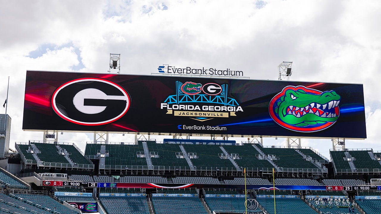 A general view of Florida Georgia signage before the start of a game between the Georgia Bulldogs and the Florida Gators at EverBank Stadium on October 28, 2023 in Jacksonville, Florida. (James Gilbert/Getty Images)