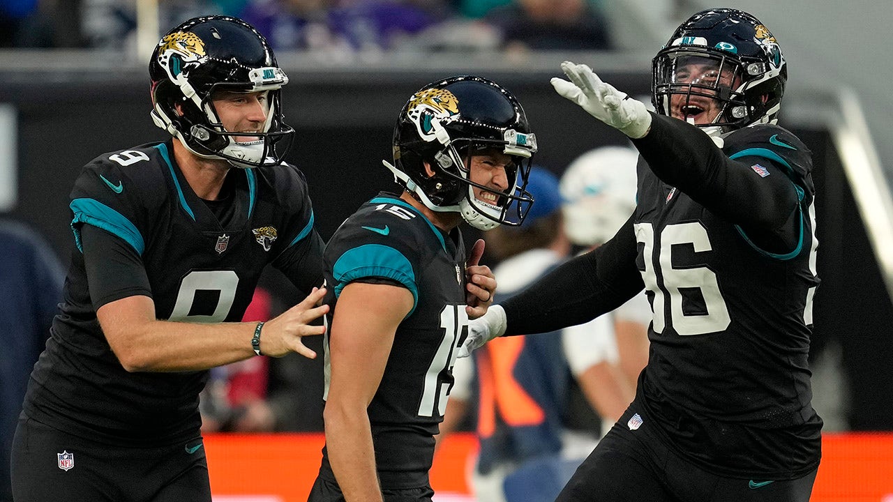 Jacksonville Jaguars kicker Matthew Wright (15), center, celebrates after kicking a field goal to win the match during the second half of an NFL football game between the Miami Dolphins and the Jacksonville Jaguars at the Tottenham Hotspur stadium in London, England, Sunday, Oct. 17, 2021. (AP Photo/Matt Dunhan)