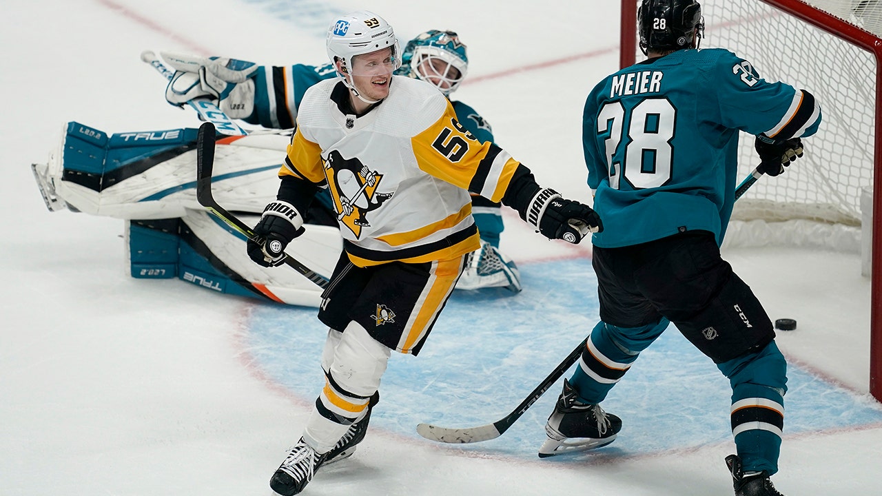 The Penguins tied it midway through the second period on Letang’s breakaway. Letang sprinted for a loose puck outside the San Jose blue line and took it the rest of the way. He faked a forehand shot and then slipped a backhander past Hill for his third goal.