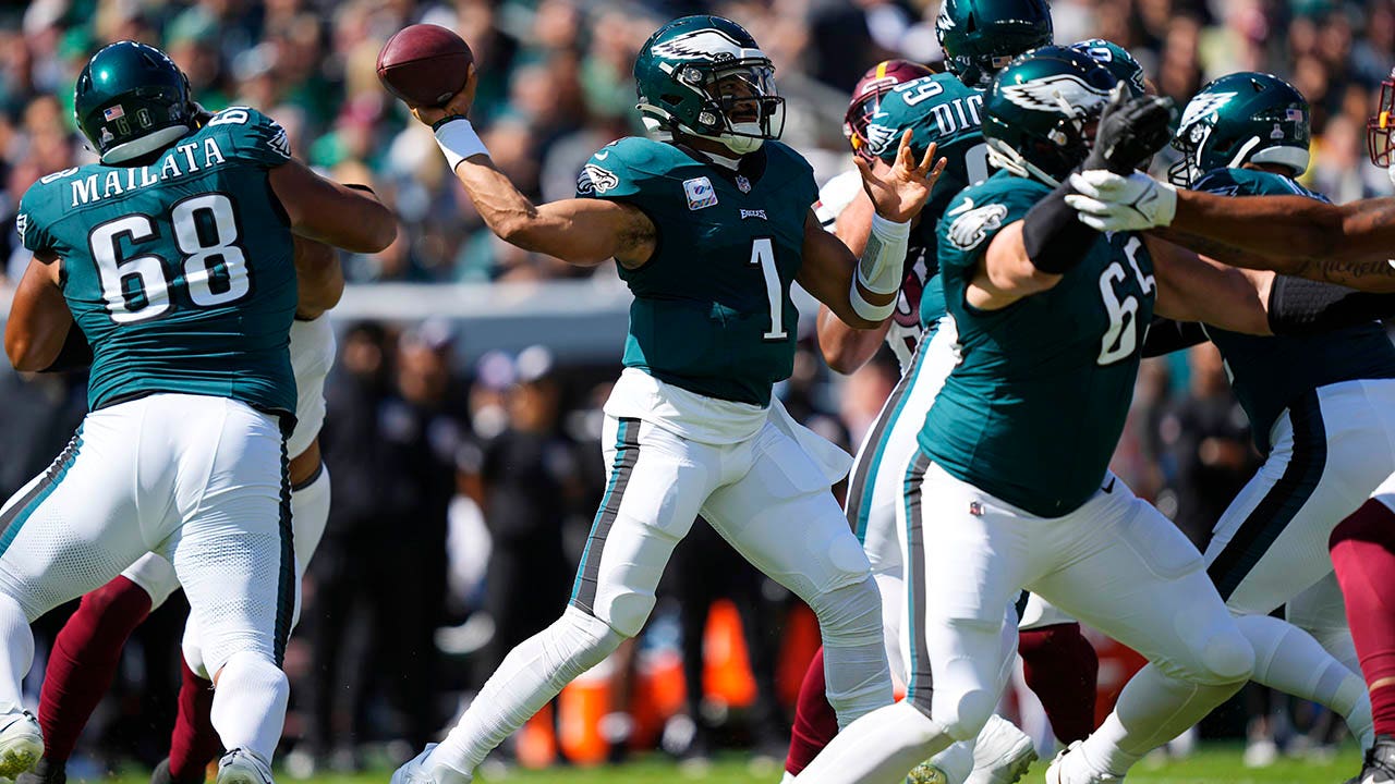 Philadelphia Eagles quarterback Jalen Hurts (1) looks to throw during the first half of an NFL football game against the Washington Commanders on Sunday, Oct. 1, 2023, in Philadelphia. (AP Photo/Matt Rourke)