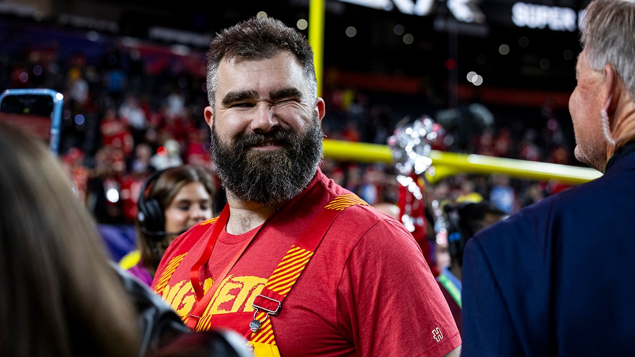 Jason Kelce winking after the Kansas City Chiefs won Super Bowl LVIII against the San Francisco 49ers at Allegiant Stadium on Sunday, February 11, 2024, in Las Vegas, Nevada. (Lauren Leigh Bacho/Getty Images)