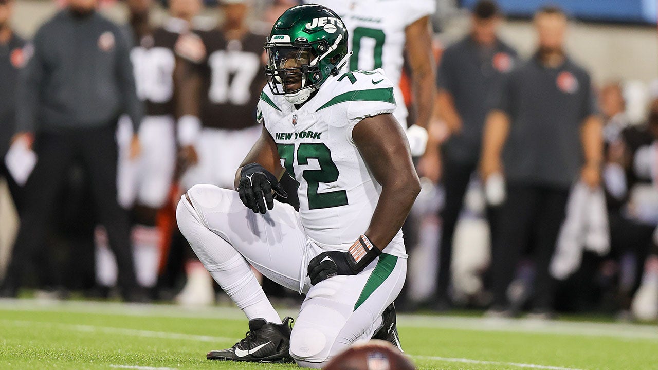 Micheal Clemons of the New York Jets jogs during the first half of a preseason game against the Tampa Bay Buccaneers at MetLife Stadium Aug. 19, 2023, in East Rutherford, N.J. (Sarah Stier/Getty Images)