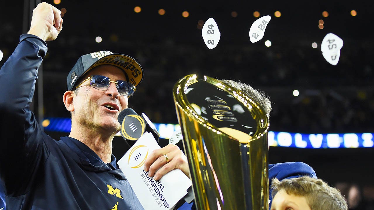 Michigan Wolverines head coach Jim Harbaugh celebrates winning the 2024 CFP National Championship game at NRG Stadium on January 8, 2024, in Houston, Texas. (CFP/Getty Images)
