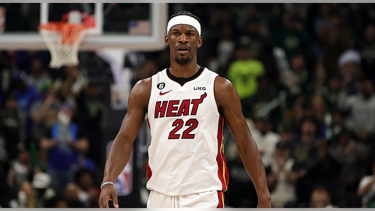Jimmy Butler #22 of the Miami Heat walks backcourt during the first half of Game One of the Eastern Conference First Round Playoffs against the Milwaukee Bucks at Fiserv Forum on April 16, 2023 in Milwaukee, Wisconsin. (Stacy Revere/Getty Images)