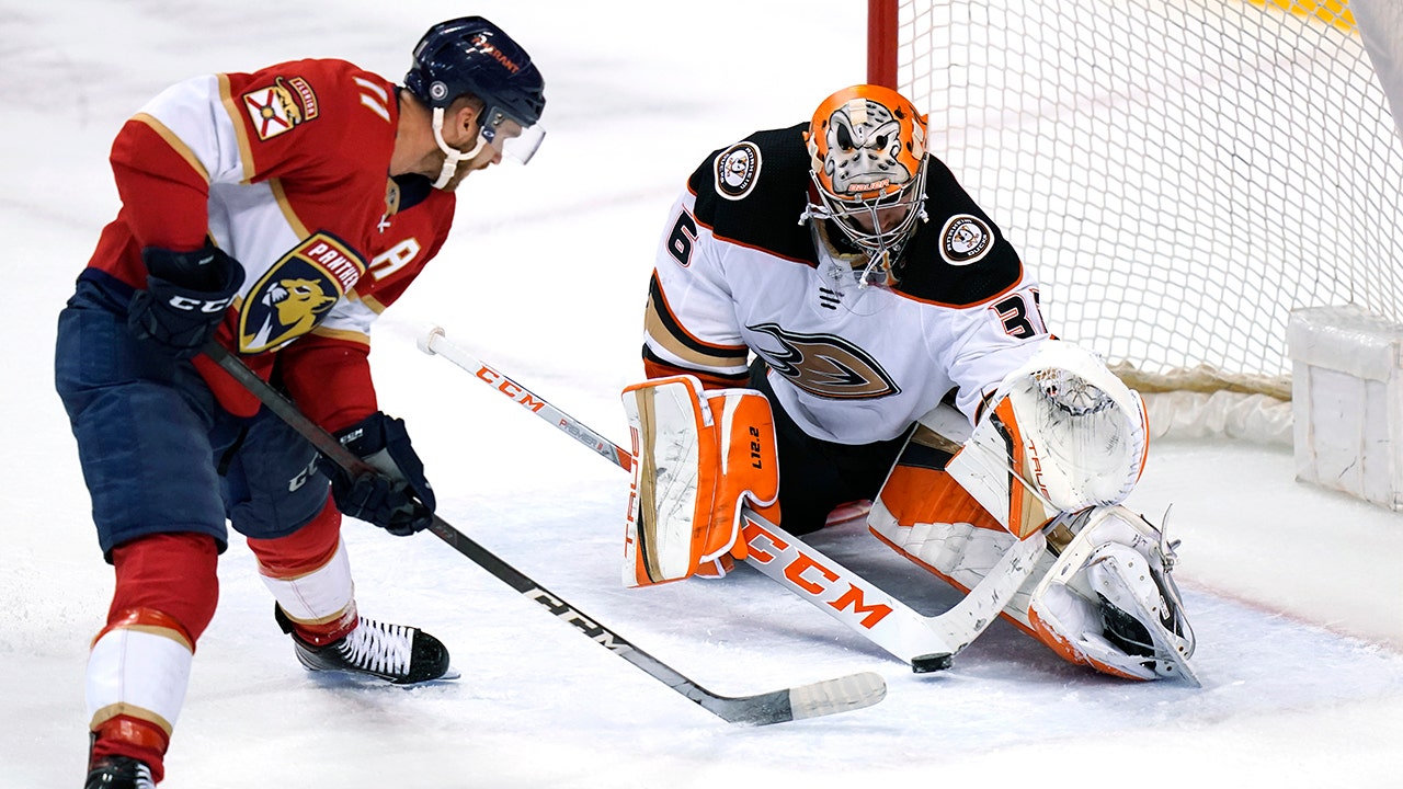 Duclair’s first goal, a shot from behind the net that bounced off the skate of defenseman Jamie Drysdale and under Gibson’s pad, tied the score 1-all 1:44 into the second.