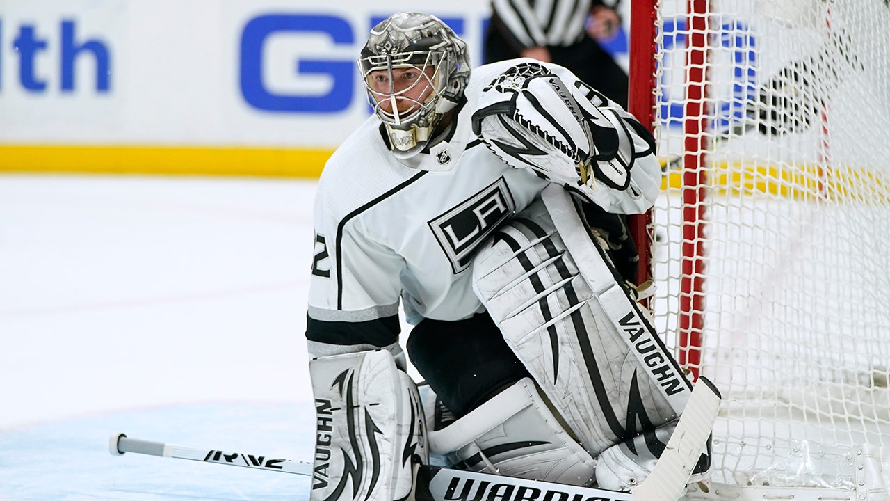 Los Angeles Kings goaltender Jonathan Quick watches play during the second period of the team's NHL hockey game against the Anaheim Ducks Friday, Feb. 25, 2022, in Anaheim, Calif. Quick became the fourth American-born goalie to reach 350 victories in the NHL as the Kings won 4-1. (AP Photo/Jae C. Hong)