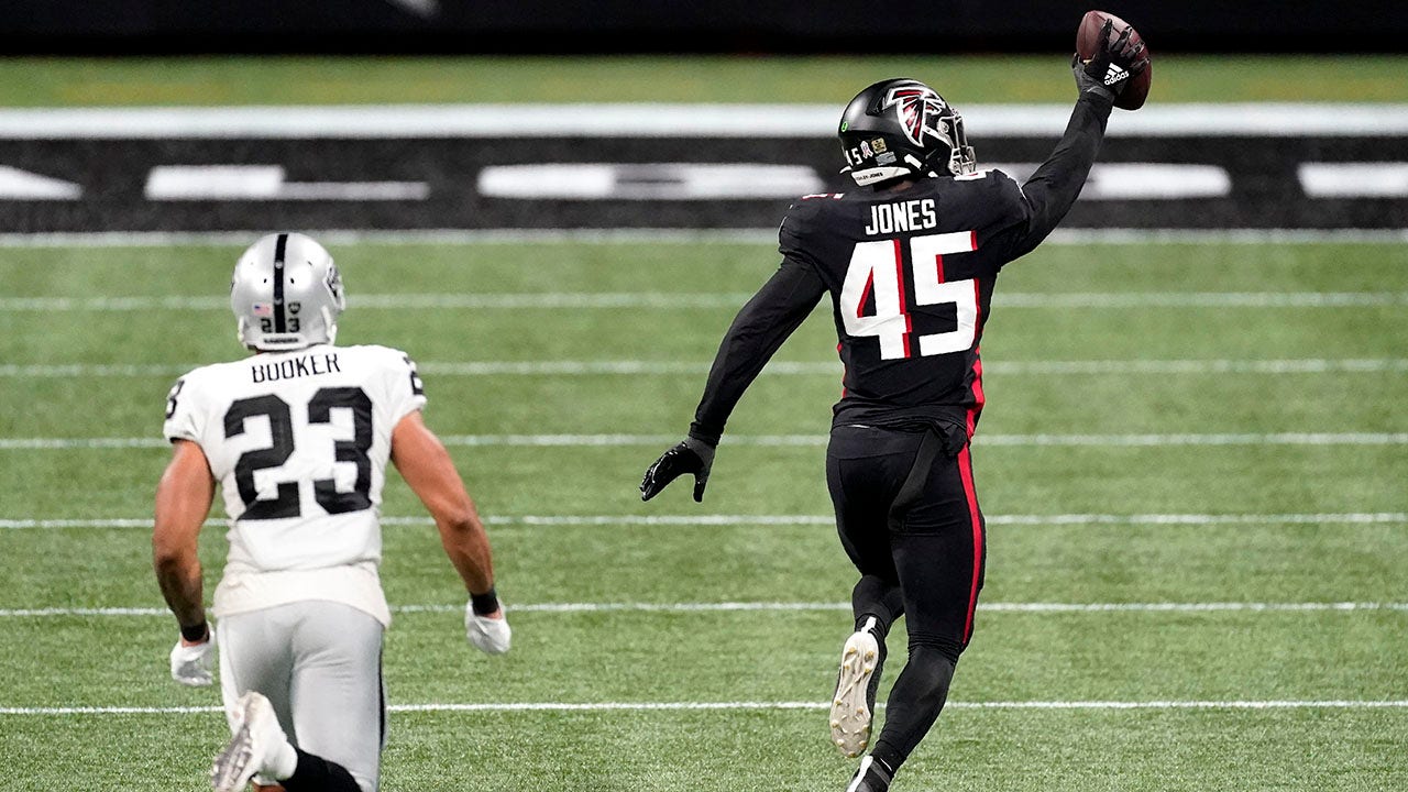 Deion Jones returned an interception 67 yards for a touchdown, Matt Ryan threw a pair of short scoring passes, and the Atlanta Falcons thoroughly dominated Derek Carr and the bumbling Las Vegas Raiders 43-6 on Sunday.