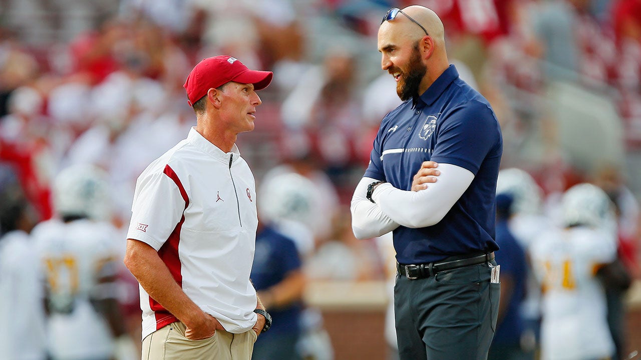 Head coach Brent Venables of the Oklahoma Sooners, left, talks with head coach Sean Lewis of the Kent State Golden Flashes before their game at Gaylord Family Oklahoma Memorial Stadium Sept. 10, 2022, in Norman, Oka. Oklahoma won 33-3. (Brian Bahr/Getty Images)