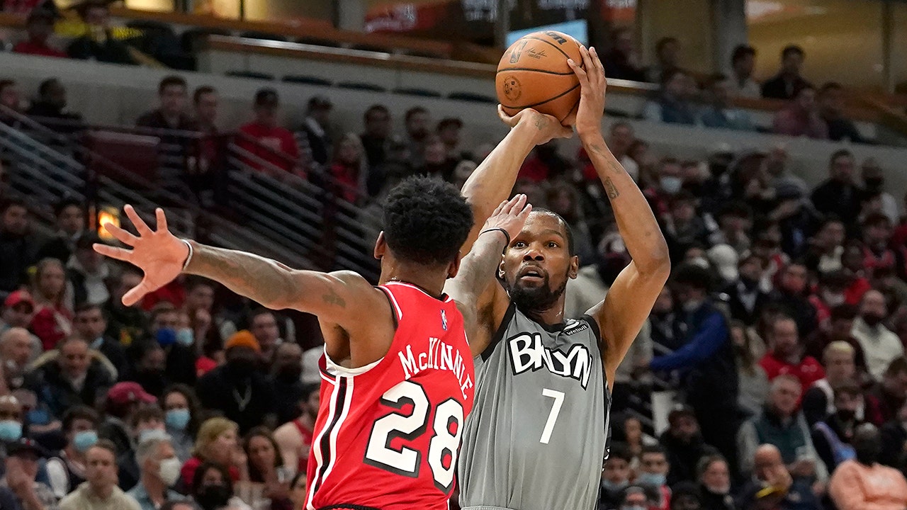 Brooklyn Nets' Kevin Durant shoots over Chicago Bulls' Alfonzo McKinnie during the first half of an NBA basketball game Wednesday, Jan. 12, 2022, in Chicago. (AP Photo/Charles Rex Arbogast)
