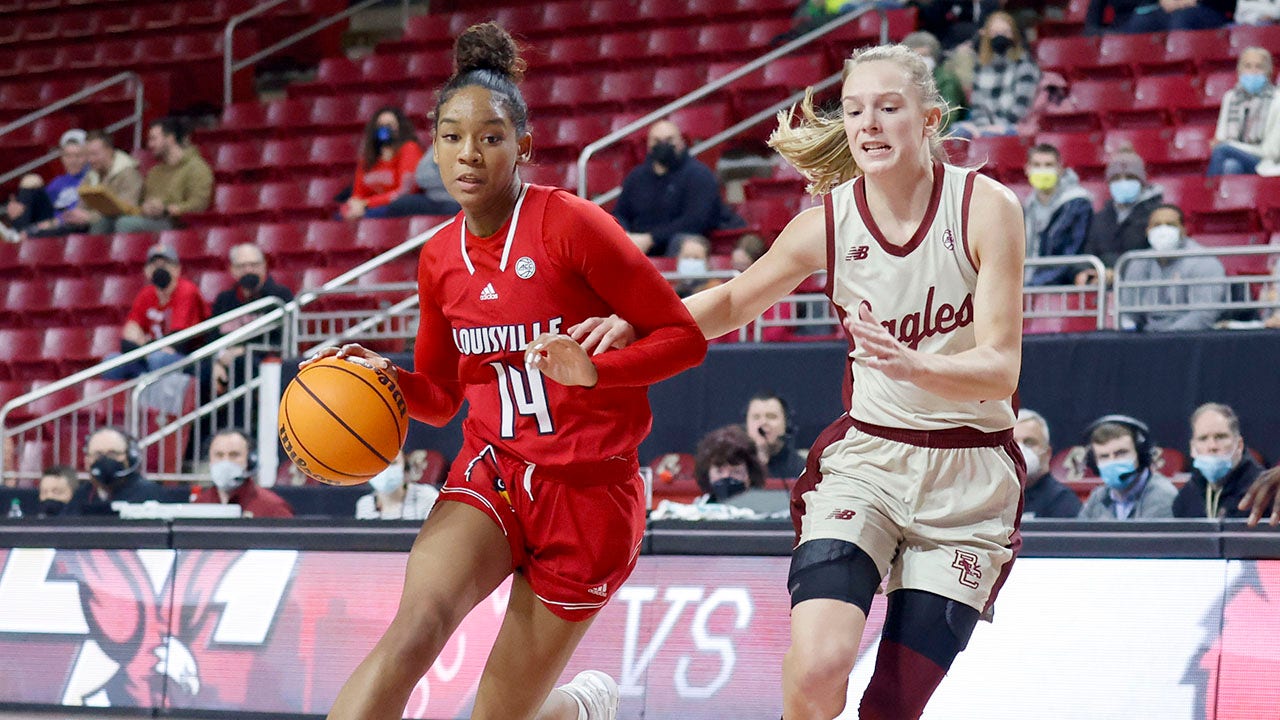Louisville guard Kianna Smith (14) drives the ball up the court as Boston College guard Cameron Swartz (1) defends during the first half of an NCAA college basketball game, Sunday, Jan. 16, 2022, in Boston. (AP Photo/Mary Schwalm)