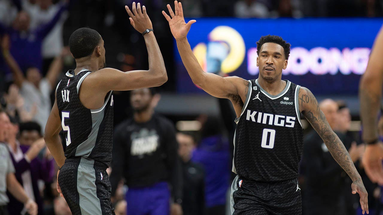 Sacramento Kings guards De'Aaron Fox (5) and Malik Monk (0) celebrate in the third quarter during Game 1 against the Golden Sate Warriors in the first round of the NBA basketball playoffs in Sacramento, Calif., Saturday, April 15, 2023. The Kings won 126 - 123. (AP Photo/José Luis Villegas)
