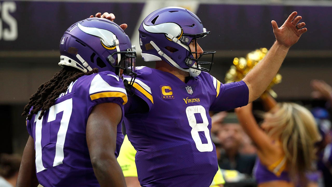 Minnesota Vikings quarterback Kirk Cousins (8) celebrates with teammate K.J. Osborn after scoring on a 17-yard touchdown run against the Arizona Cardinals, Oct. 30, 2022, in Minneapolis. (AP Photo/Bruce Kluckhohn)