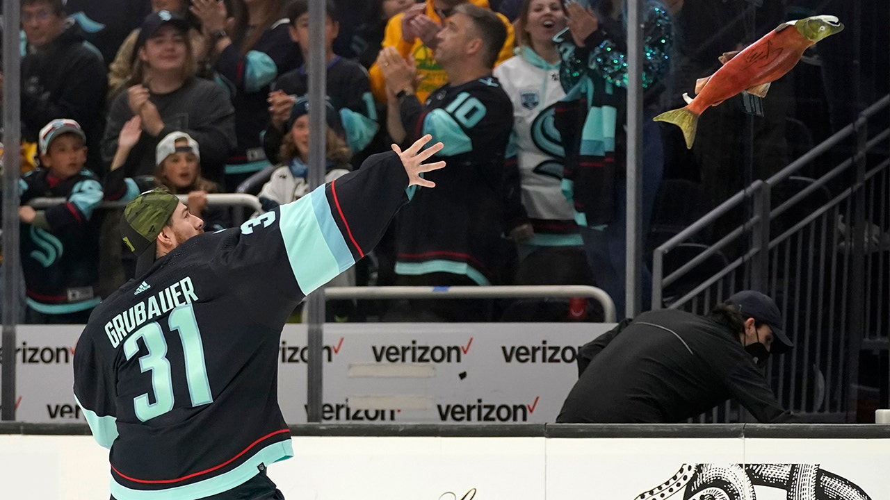 Seattle Kraken goaltender Philipp Grubauer tosses a stuffed salmon to fans after the team's NHL hockey game against the San Jose Sharks, Friday, April 29, 2022, in Seattle. The Kraken won 3-0. (AP Photo/Ted S. Warren)