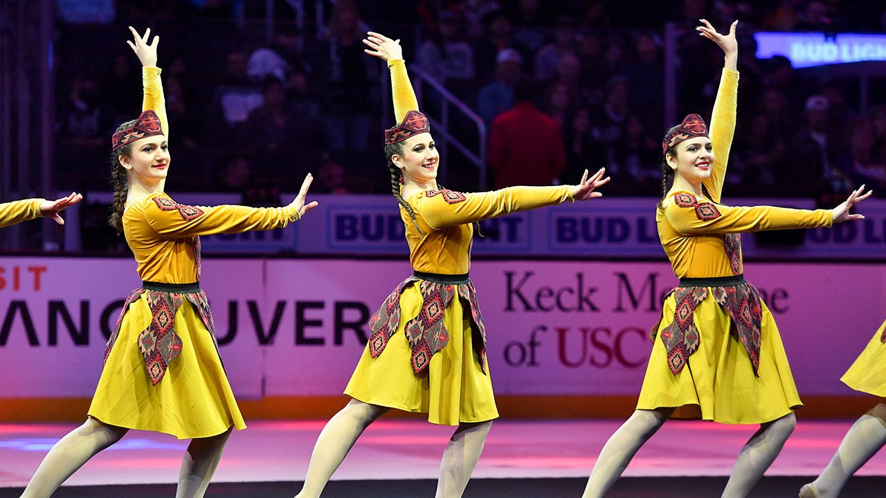 Performers dance on Armenian Heritage Night during the first period between the Utah Hockey Club and the Los Angeles Kings at Crypto.com Arena Feb. 22, 2025, in Los Angeles. (Juan Ocampo/NHLI via Getty Images)