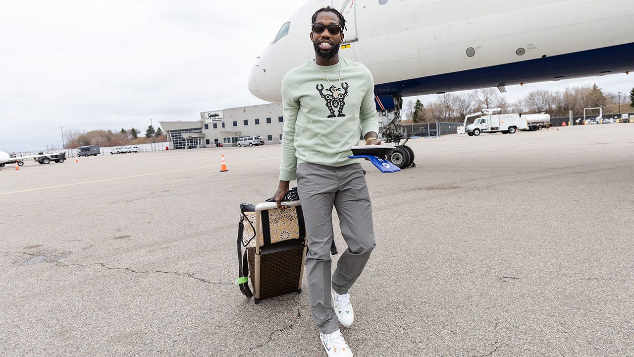 Patrick Beverley of the Timberwolves boards the plane before Game 5 of the playoffs against the Memphis Grizzlies at Minneapolis-St. Paul International Airport on April 25, 2022. (David Sherman/NBAE via Getty Images)