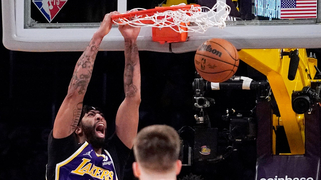 Los Angeles Lakers forward Anthony Davis, left, dunks as guard Austin Reaves watches during the first half of an NBA basketball game against the Utah Jazz Wednesday, Feb. 16, 2022, in Los Angeles. (AP Photo/Mark J. Terrill)