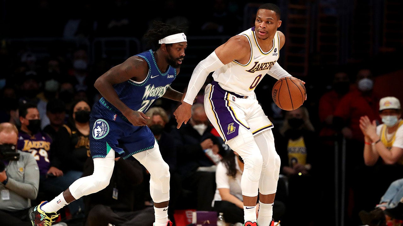 Russell Westbrook of the Lakers handles the ball against Patrick Beverley of the Minnesota Timberwolves at Crypto.com Arena on Jan. 2, 2022, in Los Angeles. (Katelyn Mulcahy/Getty Images)