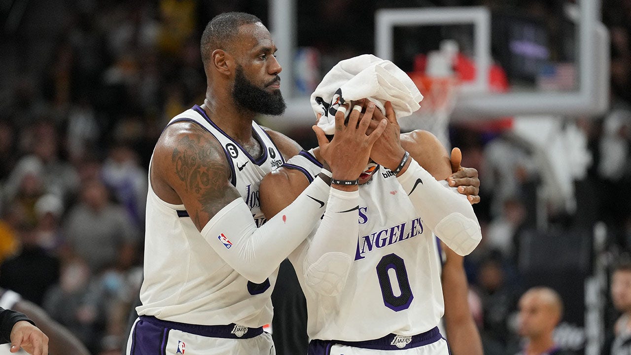 LeBron James holds a towel to the head of Russell Westbrook during the Spurs game in San Antonio on Nov. 26, 2022. (Daniel Dunn-USA Today Sports)