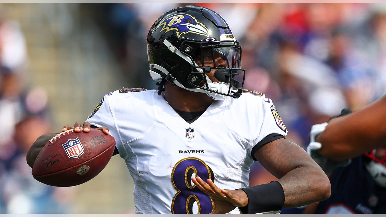 Quarterback Lamar Jackson of the Baltimore Ravens attempts a pass during the second half against the New England Patriots at Gillette Stadium in Foxborough, Massachusetts, on Sept. 25, 2022. (Adam Glanzman/Getty Images)