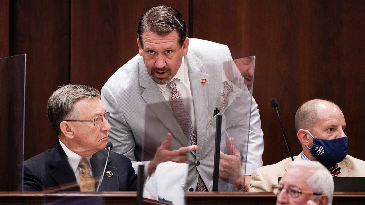 FILE - Rep. Jeremy Faison, R-Cosby, center, talks with Rep. Dan Howell, R-Georgetown, left, during a meeting, Aug. 11, 2020, in Nashville, Tenn. A top Tennessee House Republican lawmaker has apologized for losing his temper and being ejected from watching a high school basketball game after getting into a confrontation with a referee, including a brief gesture at pulling down the official's pants that is visible in video footage of the game. On Tuesday, Jan. 4, 2022 Rep. Jeremy Faison, 45, posted on Twitter that he "acted the fool tonight and lost my temper on a ref." (AP Photo/Mark Humphrey, file)