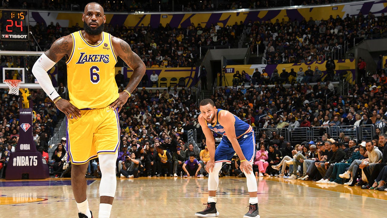 LeBron James (6) of the Los Angeles Lakers and Stephen Curry (30) of the Golden State Warriors during a game March 5, 2022, at Crypto.Com Arena in Los Angeles. (Andrew D. Bernstein/NBAE via Getty Images)