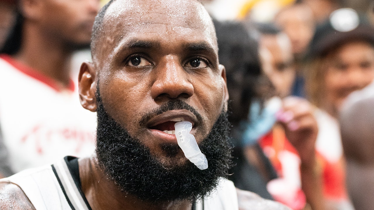 LeBron James sits during a timeout at the Drew League pro-am July 16, 2022, in Los Angeles. (Cassy Athena/Getty Images)
